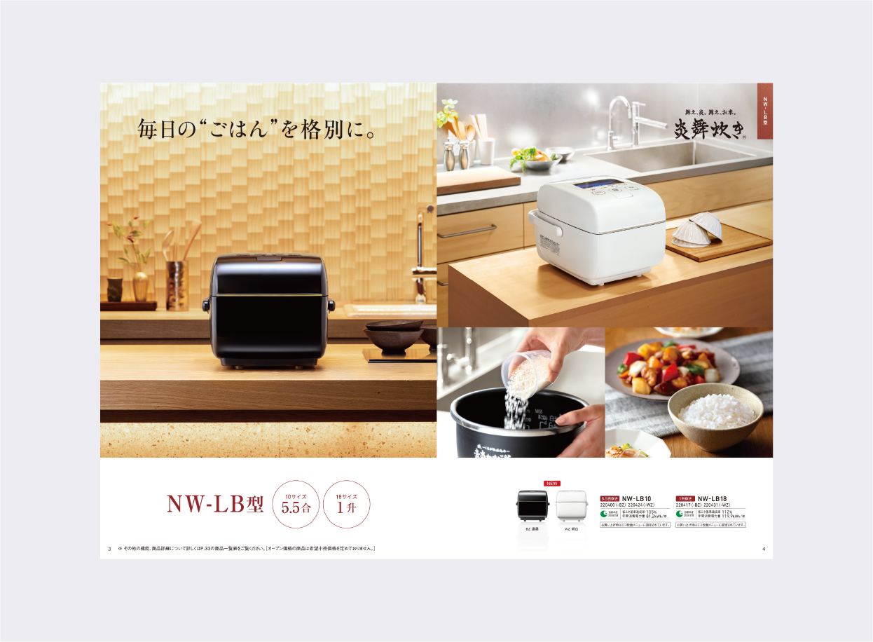 象印マホービンのメイン商材である炊飯器のカタログを企画構成からデザイン・撮影までトータルに携わりました。